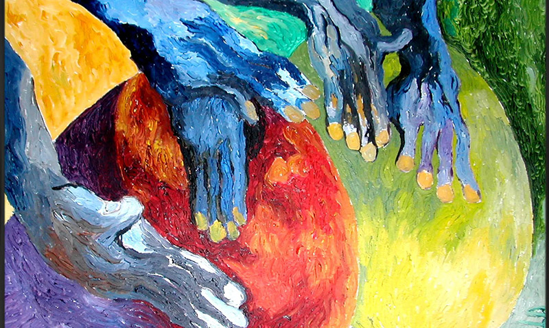 This longing for beauty is only the beginning, to find the proper means and use them is the next step and this is exactly the boogie step Monica is dancing on canvas and in colour, lots of colour, wild colour, beating the rhythm of her life which is being happy – making happy and carrying you along on a breathtaking magical mystery tour that flows into an ocean of beauty.